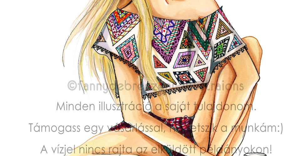 A modell mozdulatait híresebb lányokról lesem mindig, általában pinteresten. Szerintem a legjobb módja annak, hogy ezt valaki megtanulja, ha simán csak lemintázza valakiről, a suliban ezt krokizásként ismerjük. Na nekem ez suliban sosem ment, de inkább azért, mert öt percben csak firkákat tudtam produkálni, és mai napig ez a művelet veszi el a legtöbb időmet. A jövőben minél látványosabb pózokat szeretnék szemléletetni, úgyhogy lesz munkánk bőven, de ezen legalább látni a fejlődést mindig. Ruhában is fejlődtem, bár merem állítani, hogy azzal sosem volt gondom annyi, mint a test többi részével. Maximum az látható, hogy már nem csicsázom annyira az egészet, mármint csak mintákkal érzékeltetem az izgalmasságot, és hanyagolom a felesleges kellékeket. Azonban ha hiszitek ha nem, a markerekkel való árnyékolás sokkal nehezebb, mint ceruzával. És térjünk rá a technikai változásokra. Láthatjátok, hogy sokkal szebbek a színek, szinte olyan, mintha gépen csináltam volna. Pedig eddig sem volt célom, hogy photoshopban illusztráljak, talán sosem lesz, de a markerek megadják ennek a látszatát. Később írok ezekről az eszközökről, most csak összehasonlításként a ceruzával láthatjátok, hogy míg a ceruza picit csíkoz, addig a marker összefolyik. Ez azért is van, mert egy olyan filcről beszélünk, ami kicsit alkoholosabb a sima filcnél, ám nem áztatja úgy át a papírt kisebb felületetn (csak nagyon). Maga a marker azért jött be nekem, mert scannelésnél nem bomlanak fel a pixelek, hiszen ceruzás rajznál állíthattam 1200-ra a dpi-t, akkor is láttam a fehér pöttyöket, itt pedig semmi ilyennek nem találkozunk. Ha már említettem, akkor igen, érdemes 600-1200 dpi-ben scannelni akkor is, ha hatalmas és lassú, sokkal szebb lesz a kép. Photoshopba téve körülvágom mindig, és egy A4-es lapra teszem, mintha az lenne az eredeti lapom, de erről is később írok nektek!:) Három változatban mentem el a photoshop file mellett, egy instagram változat ahol a logóm szerepel, egy vízjeles a honlapomra, illetve egy harmadik, amit majd printként meg lehet vásárolni.:)